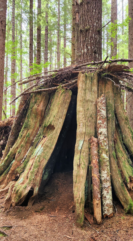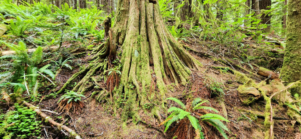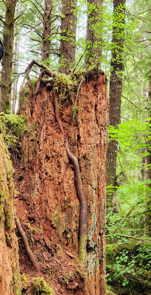 This is a trail where you’ll find as much wonder when you look up as when you look down. Towering elders stretched to the heavens while tiny mushrooms, quiet fungi, and nurse logs hosted entire micro-worlds beneath our gaze. Even the massive stumps, some more than ten feet wide, seemed to hold stories within their rings—stories older than any of us.